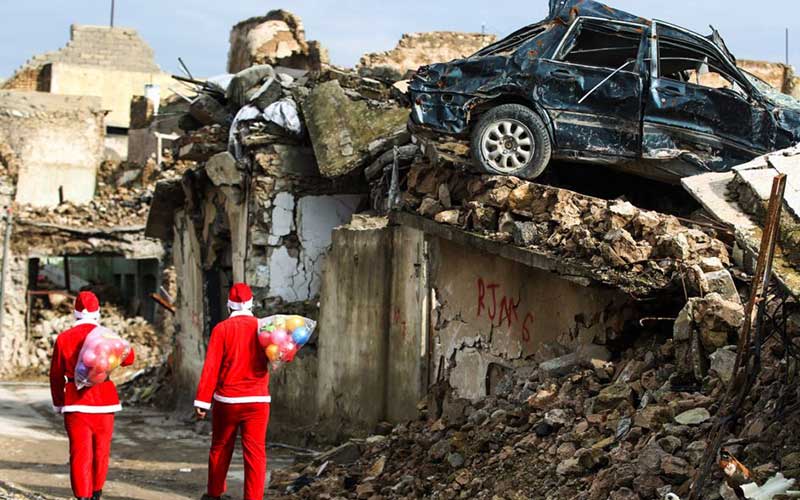 دو عراقی بابانوئل در میان خرابه های موصل