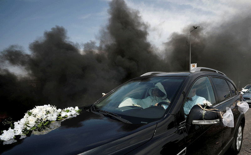 یک عروس و داماد فلسطینی در حال عبور از مقابل درگیری های غزه