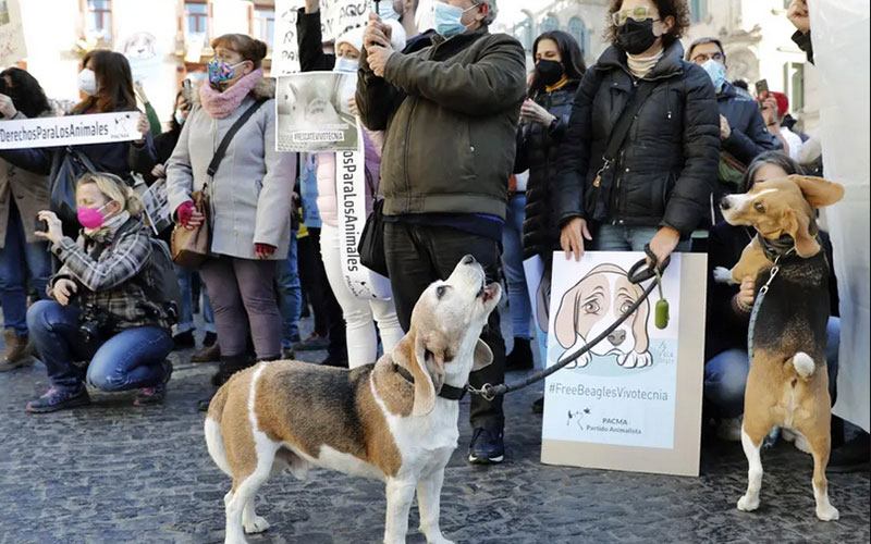 تجمع اعتراضی دوستداران حیوانات در مقابل آزمایشگاهی در شهر بارسلونا اسپانیا که متهم به استفاده از بیش از ۳۰ توله سگ برای تحقیقات دارویی است./ EPA