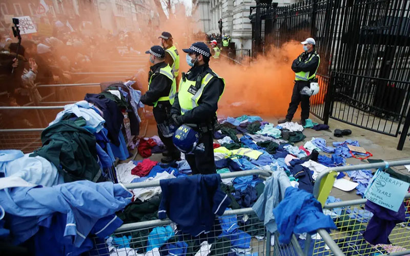 تظاهرات کارکنان ناراضی سیستم بهداشت و درمان انگلیس علیه محدودیت های الزام آور واکسیناسیون کادر درمان در خیابان مقر نخست وزیری انگلیس/ رویترز
