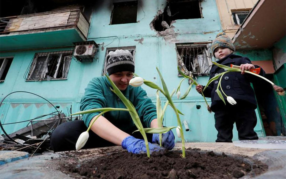 خانواده اوکراینی در شهر “ماریوپول” که خانه شان در اثر حملات موشکی روسیه آسیب دیده در محوطه خانه گل می کارند./ رویترز
