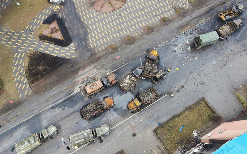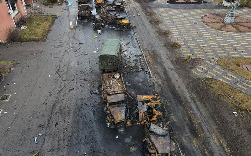 خودروهای نظامی منهدم شده روسیه در شهر ” بورودیانکا” در استان ” کی یف” اوکراین/ رویترز