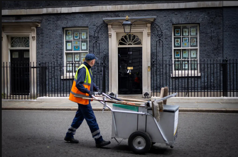 عبور رفتگر لندنی از مقابل ساختمان مقر نخست وزیری انگلیس/ EPA