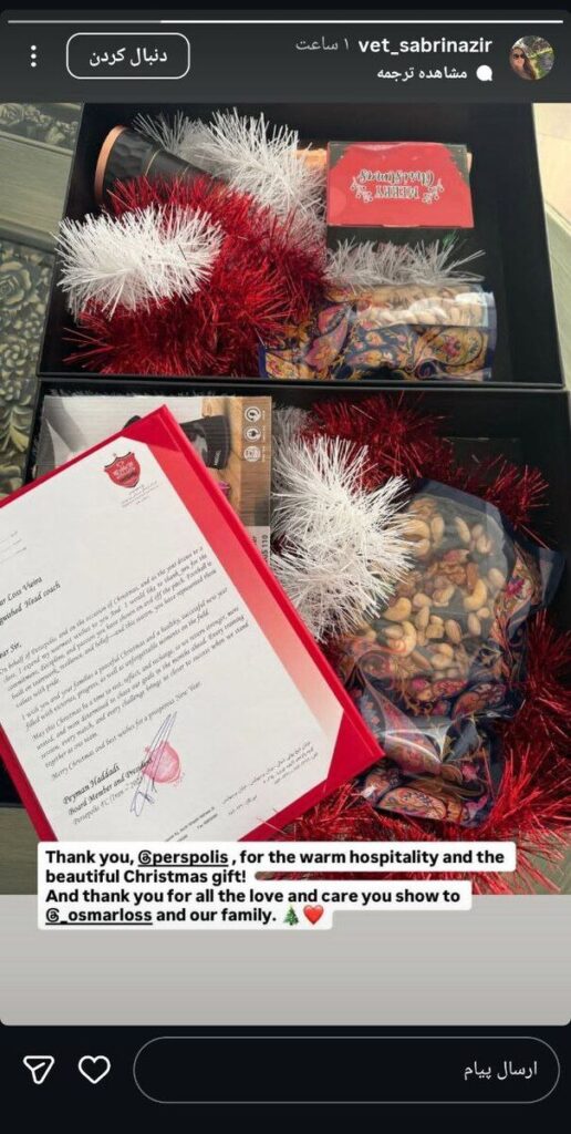 همسر سرمربی سرخها در یک استوری نوشت: «ممنون پرسپولیس، برای مهماننوازی گرم و هدیه زیبای کریسمس و از شما به خاطر تمام محبت و توجههایی که به اوسمار و خانوادهمان نشان میدهید، متشکرم.»