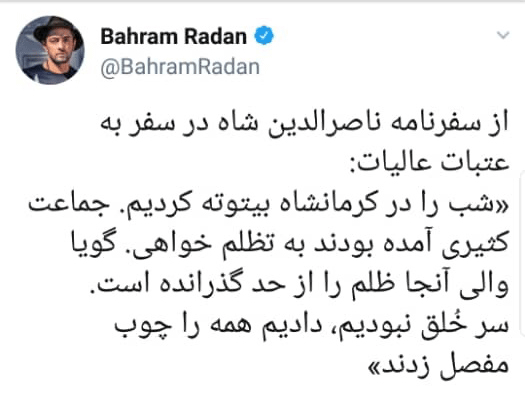 بهرام رادان، بازیگر محبوب سینما با نوشتن حکایتی از سفرنامه ناصرالدین شاه به بحران بی آبی خرمشهر واکنش نشان داد. او نوشت: