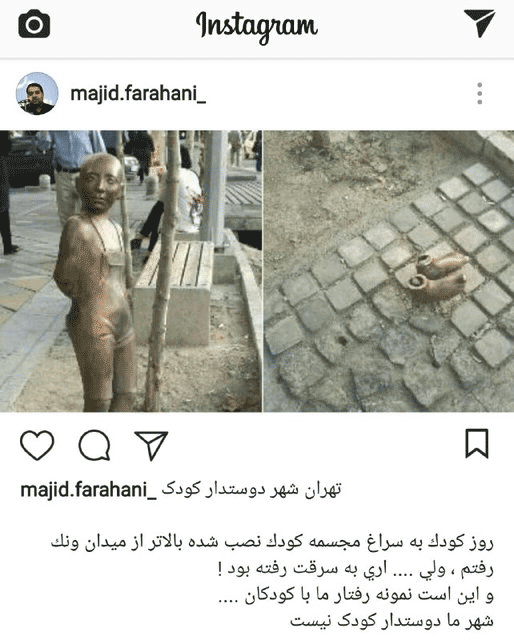 مجید فراهانی در صفحه اینستاگرام خود که با عنوان« تهران دوستدار کودک » بود، نوشت: روز کودک به سراغ مجسمه کودک نصب شده بالاتر از میدان ونک رفتم… اما به سرقت رفته بود!