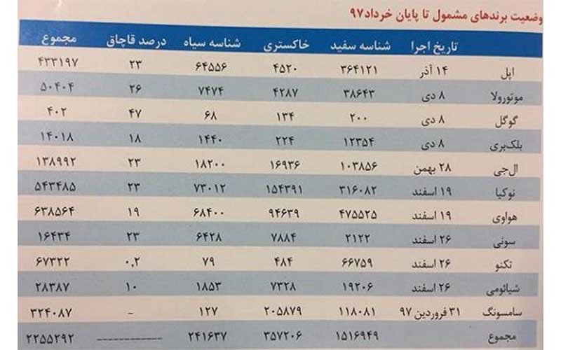 برمبنای آمار ارائه شده تا پایان خرداد ۹۷ از میان حدود ۲ میلیون و ۲۲۵ هزار گوشی رجیسترشده، بیشترین آمار به برندهای هواوی، نوکیا، اپل و سامسونگ تعلق داشته و بیشترین تعداد گوشی های قاچاق یا گوشی هایی که بعد از مدت یک ماهه مقرر، نسبت به رجیستری اقدام نکردند به ۳ برند اپل، نوکیا و هواوی تعلق دارد.