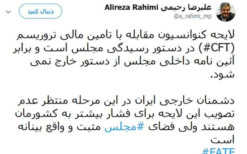 علیرضا رحیمی، نماینده تهران در مجلس در توئیتی نوشت: «لایحه کنوانسیون مقابله با تامین مالی تروریسم (CFT#) در دستور رسیدگی مجلس است و برابر آئین نامه داخلی مجلس از دستور خارج نمی شود. دشمنان خارجی ایران در این مرحله منتظر عدم تصویب این لایحه برای فشار بیشتر به کشورمان هستند ولی فضای #مجلس مثبت و واقع بینانه است.»