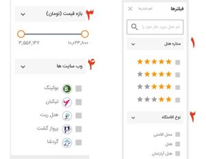 ۱.فیلتر اول مربوط به تعداد ستارههای هتل است. میتوانید از دو تا ۵ ستاره هتلهای مورد نظر خود را فیلتر کنید تا تنها آن هتلها را در لیست مشاهده کنید.