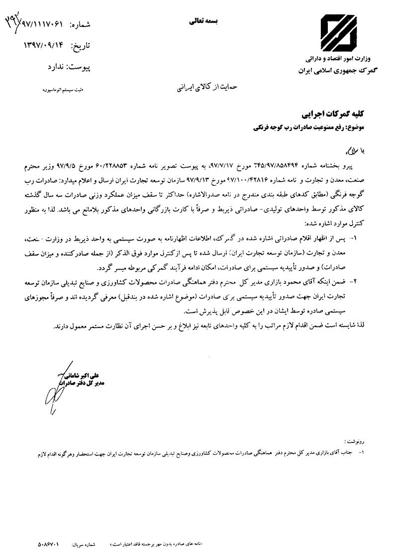 در قسمتی از این بخشنامه آمده است: صادرات رب گوجه فرنگی (مطابق کدهای طبقه بندی مندرج در نامه صدرالاشاره) حداکثر تا سقف میزان عملکرد وزنی صادرات سه سال گذشته کالای مذکور توسط واحدهای تولیدی-صادراتی ذیربط و صرفا با کارت بازرگانی واحدهای مذکور بلامانع می باشد.