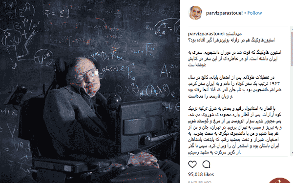 پرویز پرستویی بازیگر پیشکسوت و محبوب سینما و تلویزیون نیز با نقل خاطرهای از هاوکینگ، ارادتش به وی را نشان داد. پرستویی در اینستاگرام خود نوشت: