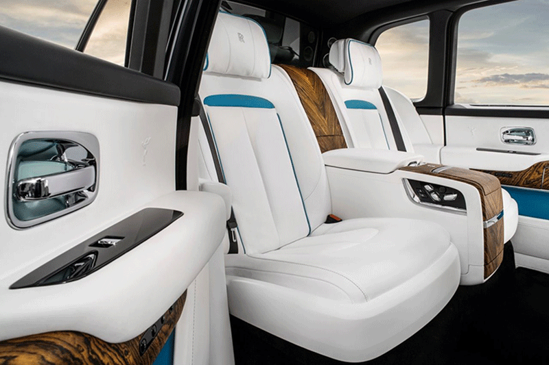 مسلما بهترین مکان در محصولات رولزرویس، صندلیهای عقب هستند. در کولینان هم، انبوهی از چرم در این قسمت دیده میشود که به لطف فاصلهی زیاد تا صندلی جلو و قابلیت تنظیم برقی در جهات مختلف، راحتی کمنظیری برای سرنشیان فراهم میکند. بسیاری از فناوریهای مدرن، مثل نمایشگر و اینترنت هات اسپات در اختیار مسافران کولینان قرار دارد، ضمن اینکه در فضای نسبتا زیاد بین صندلیهای عقب، یخچال، نگهدارندهی ۲ جام برای نوشیدن و بطری سایز بزرگ، پیشبینی شده است. این بخش، در تیپهای مختلف با نمای متفاوتی همراه خواهد بود و میتواند حذف شود تا فضای سرنشینان صندلی عقب به ۳ نفر افزایش پیدا کند.