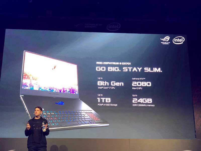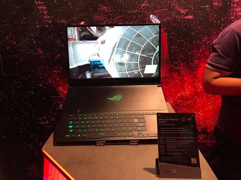 اما لپتاپ دیگر ایسوس، Zephyrus S نام دارد. این لپتاپ باریکترین لپتاپ گمینیگ دنیا است که دارای کارت گرافیک انویدیا RTX 2080 Max-Q است. ۸۱ درصد نسبت نمایشگر به بدنه دارد و در حقیقت یک لپتاپ ۱۷ اینچی است که در بدنه یک لپتاپ ۱۵ اینچی قرار گرفته شده است. زفیروس اس جدید نسبت به نسل قبلی خود ۲۳ درصد کوچکتر و ۴۰ درصد باریکتر شده است و دارای یک دکمه مخصوص برای تنظیم حجم صدا است. فیل لیانگ برای ثابت کردن حرفهای خود، یک کولهپشتی مخصوص لپتاپهای ۱۵ اینچی را به روی استیج آورد و از درون آن لپتاپ زفیروس اس ۱۷ اینچی را بیرون کشید.