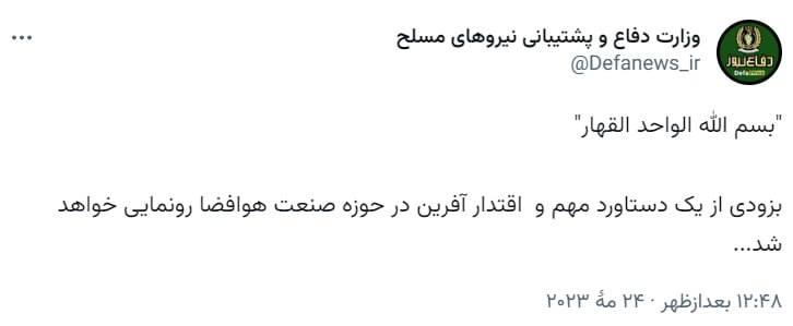 حساب توییتری منتسب به وزارت دفاع و پشتیبانی نیروهای مسلح خبرداد، به زودی از یک دستاورد مهم در صنعت هوافضا (احتمالا موشکی) رونمایی خواهد شد.