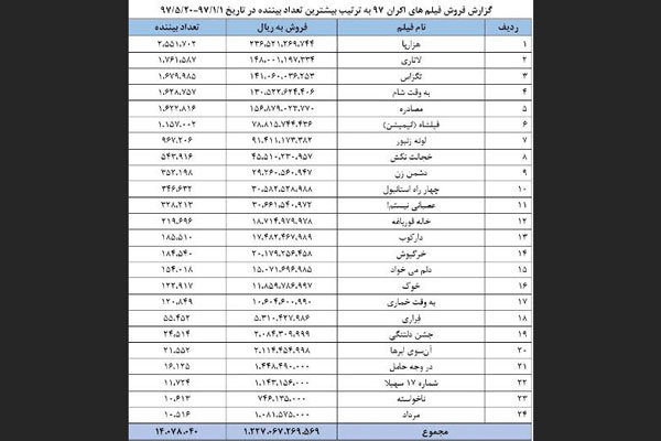 آمار فیلم های اکران ۹۷ تا ۲۰ مرداد از نظر میزان فروش و تعداد بیننده اعلام شد.