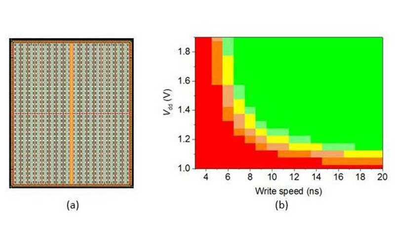 (a) تصویر مدل ماکت از STT-MRAM با ظرفیت ۱۲۸ مگابیت (b) نمودار سرعت نوشتن در رم براساس ولتاژ منبع تغذیه