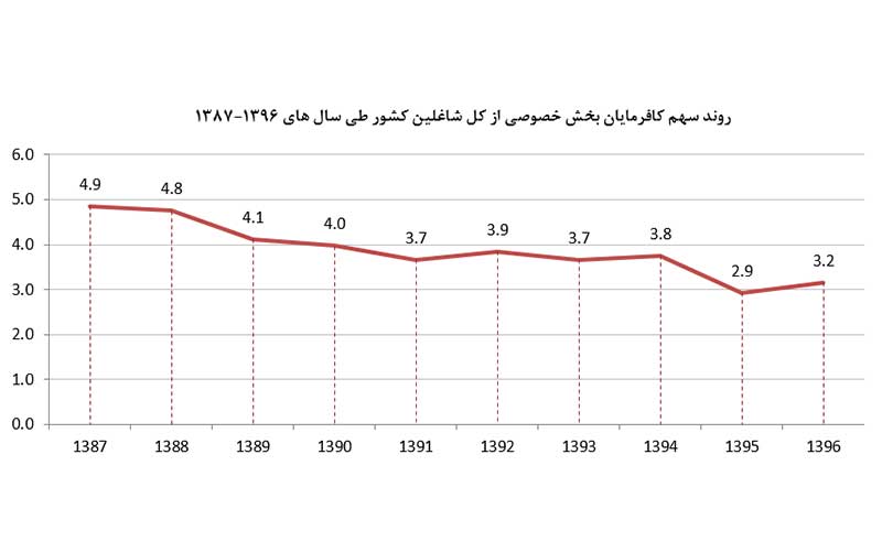 سهم شاغلان کارفرمای بخش خصوصی از کل شاغلان کشور از ۴.۹درصد در سال ۸۷ به ۳.۲ درصد در سال ۹۶ کاهش یافته است.