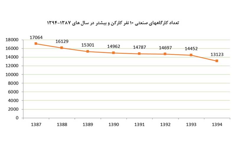 اما آمار رسمی از وضعیت بنگاه های صنعتی به استناد مرکز آمار ایران نشان می دهد، تعداد کارگاههای صنعتی بالای ۱۰ نفر کارکن کشور، از سال ۱۳۸۷ تا سال ۱۳۹۴ به طور مستمر کاهش یافته است.
