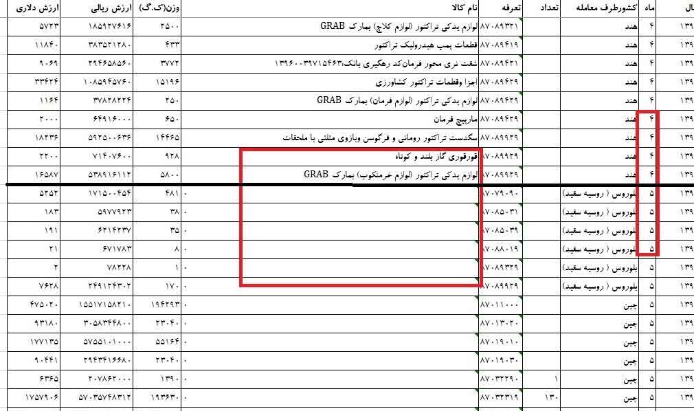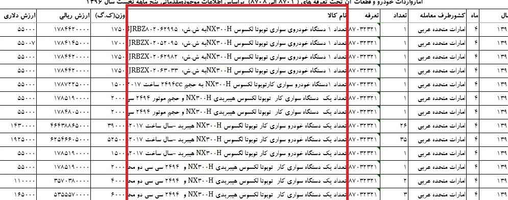 جدول زیر نمونهای از نحوه انتشار جزییات آمار واردات خودرو در تیر ماه (و ماههای قبل) است که هنوز قسمت نام کالا دستخوش سانسور نشده بود.