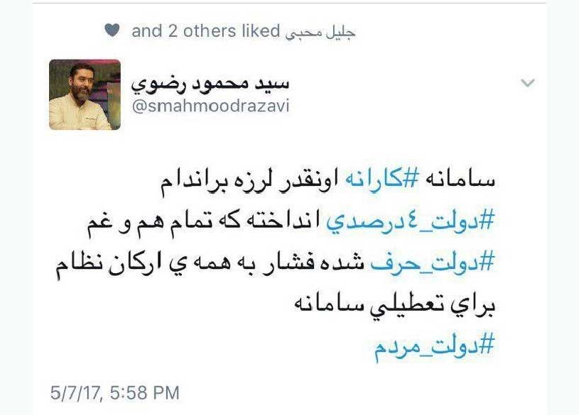 وی در این پیام نوشت: سامانه کارانه اون قدر لرزه بر اندام دولت ۴ درصدی انداخته که تمام هم و غم دولت حرف شده فشار به تمام ارکان نظام برای تعطیلی سامانه.