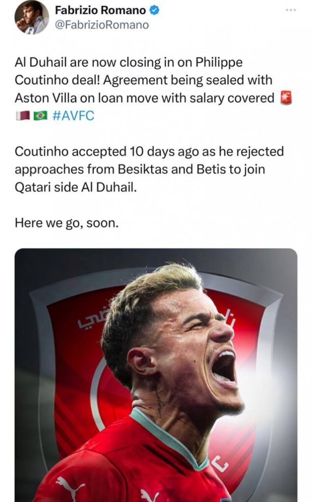 الدحیل اکنون به قرارداد فیلیپه کوتینیو نزدیک شده است و در حال توافق نهایی برای انتقال قرضی از استونویلا قرار گرفته و الدحیل حقوق این بازیکن را به طور کامل پرداخت خواهد کرد.