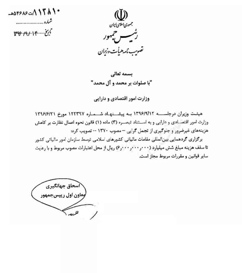 هیئت دولت با توجه به قانون نحوه اعمال نظارت بر کاهش هزینه‌های غیر ضرور و جلوگیری از تجمل گرایی، سقف هزینه اجلاس مالیاتی کشورهای اسلامی را ۶ میلیارد ریال تعیین کرد.