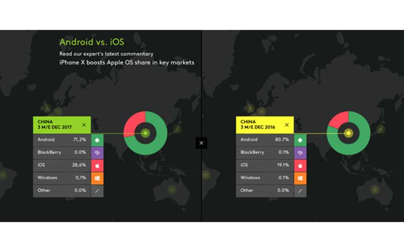به‌تازگی مؤسسه کانتار گزارش جدیدی از سهم سیستم‌عامل‌های موبایل در بازارهای مهمِ جهان منتشر کرده که نکات جالبی را در خود جای داده است. براساس این گزارش، کاربران چینی استقبال بالایی از آیفون‌های جدید کرده‌اند و سهم سیستم‌عامل iOS در سال ۲۰۱۷، با افزایش ۱۰ درصدی نسبت به مدت مشابه سال گذشته مواجه شده است؛ در حالی که سیستم‌عامل اندروید کاهشی ۹ درصدی را تجربه کرده است.