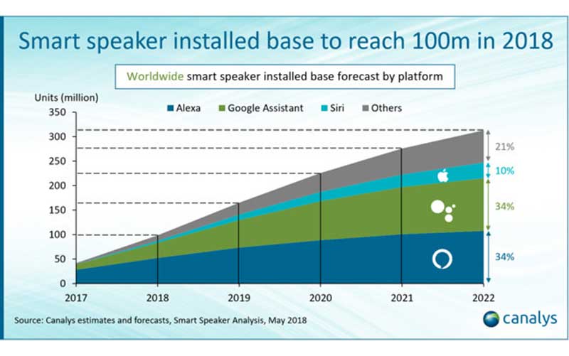 به گفتهی کانالیس اپل تا سال ۲۰۲۲ به ۱۰ درصد از سهم بازار دست پیدا خواهد کرد و سهم آمازون و گوگل نیز با یکدیگر برابر (۳۴ درصد) خواهد شد. این گزارش همچنین به این نتیجه رسیده است که ایالات متحده ۷۳ درصد، بریتانیا ۱۰ درصد و آلمان ۸ درصد از سهم بازار اسپیکر هوشمند را در اختیار خواهند داشت. کانالیس آخرین بار در ماه می ارقام فصلی اسپیکرهای هوشمند را منتشر کرد. بر همین اساس، گوگل با ۳۶.۲ درصد پیشگام بازار محسوب میشود، آمازون با ۲۷.۷ درصد به دنبال این شرکت است و دو شرکت چینی نیز جلوتر از اپل در رتبههای سوم و چهارم قرار دارند.