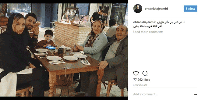 احسان خواجهامیری، خواننده پاپ و فرزند ایرج، خواننده پیشکسوت با انتشار عکسی از خود، همسر و فرزندش (ارشان) در کنار مادر و پدرش، در صفحه اینستاگرامش نوشت: «در کنار پدر و مادر عزیزم. آخر هفته خوبی داشته باشین.»