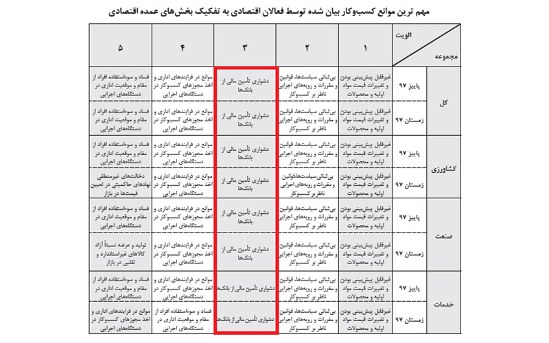 در تمامی گزارشهای منتشر شده، “دشواری تامین مالی از بانک ها” همواره یکی از سه مانع اصلی بر سر راه کسب و کارها از نظر فعالان اقتصادی بوده است. قبل از شروع تحریمها و نوسانات بازار ارز، حتی دشواری تامین مالی از بانکها به عنوان اولین و جدیترین مانع بر سر راه کسب و کارها مطرح بوده است، اما با شروع تحریمها این مانع بعد از “غیرقابل پیش بینی بودن و تغییرات مواد اولیه و محصولات” و “بی ثباتی سیاست ها، قوانین و مقررات و رویههای اجرایی ناظر بر کسب وکار” به عنوان سومین مانع مطرح شده است.