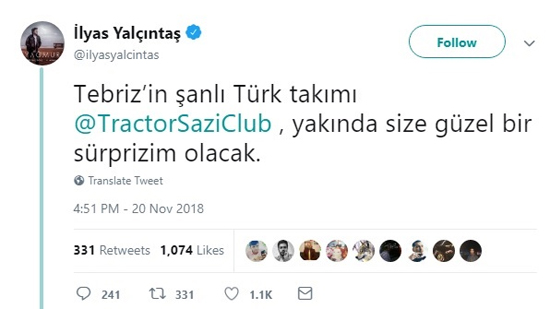 الیاس یالچینتاش خواننده سرشناس ترکیهای که در ایران نیز هوادارن بسیاری دارد، از یک سورپرایز برای هواداران تیم فوتبال تراکتورسازی تبریز خبر داد.