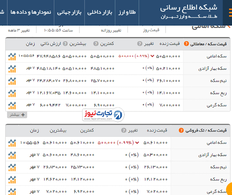 به گزارش بازتاب، بر اساس شبکه اطلاعرسانی طلا، سکه و ارز تهران (سایت منتسب به اتحادیه طلا) در اولین معامله بازار سکه، قیمت سکه امامی (ساعت ۱۰و ۵۵ دقیقه، هشتم مهر ماه سال ۱۳۹۷) با قیمت پنج میلیون و ۵۰ هزار تومان معامله شد.