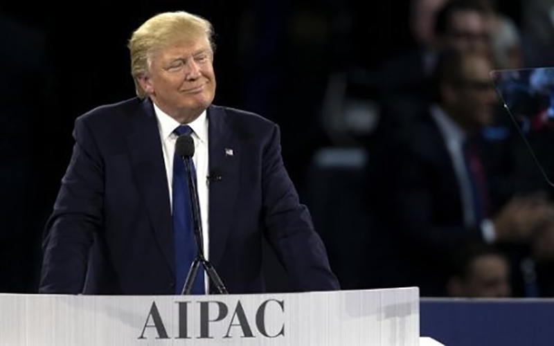 دونالد ترامپ در حال سخنرانی در گردهمایی لابی اسرائیلی آیپک