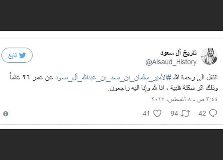 حساب کاربری “تاریخ آل سعود” در تویتی نوشت که سلمان که ۲۷ ساله بود، بر اثر سکته قلبی مرده است.