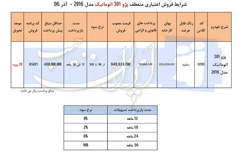 به اطلاع کلیه متقاضیان محترم محصولات شرکت ایران خودرو می رساند، شرایط فروش قسطی خودروی پژو ۳۰۱ اتوماتیک مدل ۲۰۱۶ از روز سه شنبه مورخ ۹۶/۰۹/۱۴ تا زمان تکمیل ظرفیت به شرح جداول پیوست و با شرایط ذیل ارائه می گردد: