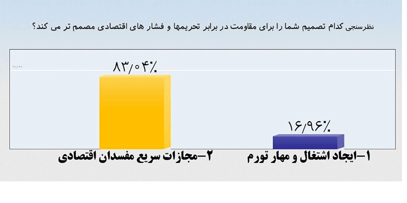 در پایان این نظرسنجی ۸۳.۴ درصد از شرکت کنندگان عنوان کردند مجازات سریع مفسدان اقتصادی ما مردم را برای مقاومت در برابر تحریم ها و فشارهای اقتصادی مصمم تر می کند.