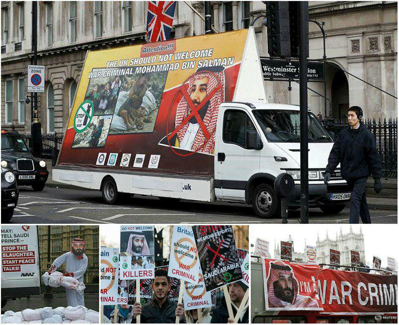 تظاهرکنندگان در خیابان «داونینگ استریت» لندن تجمع کردند و علیه محمد بن سلمان که با ترزا می، نخست وزیر انگلیس دیدار کرد، شعارهایی سردادند. شرکت کنندگان در این تظاهرات پلاکاردهایی حمل می کردند که روی آن ها نوشته شده بود «دست از یمن بردارید، بن سلمان جنایتکار جنگی است» و «از قاتلان مردم یمن در لندن استقبال نمی شود».