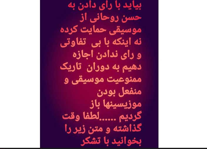 وی ادامه میدهد: «شاید هیچ وقت در این کشور، این جریان موسیقی تا این حد پویا نبوده و مورد حمایت قرار نگرفته است. از همه شما دوستانی که به نحوی با موسیقی ارتباط دارید، گروههای موسیقی فعال، دوستانی که مشغول تمرین برای کنسرت و ارائه آلبوم هستند، دوستداران و شنوندههای موسیقی میخواهم که در انتخابات شرکت کنید و با رأی به حسن روحانی، به ادامه جریان فعال موسیقی، انرژی و امید رای بدهید. بیایید فضا را برای موسیقیدانهای خوبِ نسل بعدی آماده کنیم و با بیتفاوتیِ خود، تجربه دردناک من و هم دورههایم را تکرار نکنیم. ما دوران مهمی از زندگی هنریمان را از دست دادهایم. استودیوها تعطیل بود. محلهای تمرین خلوت، گروههای موسیقی تمرین نمیکردند و آلبومی ضبط نمیشد. ناامیدی موج میزد. قدر امروز را بدانیم و چشمهایمان را نبندیم. رای تک تک ما، یک «نه» بزرگ به مخالفان موسیقی است.»