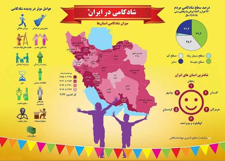 اینفوگرافی زیر به سراغ ایرانی‌ها رفته و شادی را در میان ساکنین شهرهای مختلف کشور به تفکیک مورد بررسی قرار داده است؛ بر طبق آمار، شهرهای زنجان، گلستان، بوشهر، هرمزگان، کردستان و کهگیلویه و بویراحمد در صدر لیست شادترین شهرهای کشور قرار گرفته‌ و حدود ۴۰ درصد از جمعیت کشور در سطحی متوسط از شادی به سر می‌برند.