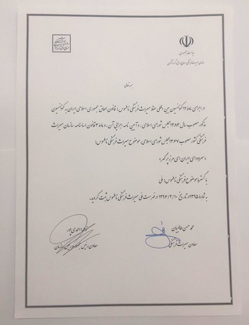 لوح ثبتی سرود ای ایران در فهرست آثار ملی کشور