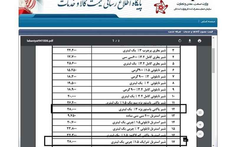 درحالی‌که آخرین قیمت هر پاکت شیر استریل تتراپک کم‌چرب (۱.۵ درصد چربی) در پایگاه اطلاع‌رسانی قیمت کالا و خدمات ۲۸۰۰ تومان درج‌شده است که این قیمت در برخی از برندهای لبنی با افزایش دو مرحله‌ای به ۳ هزار و ۲۰۰ تومان رسیده است.