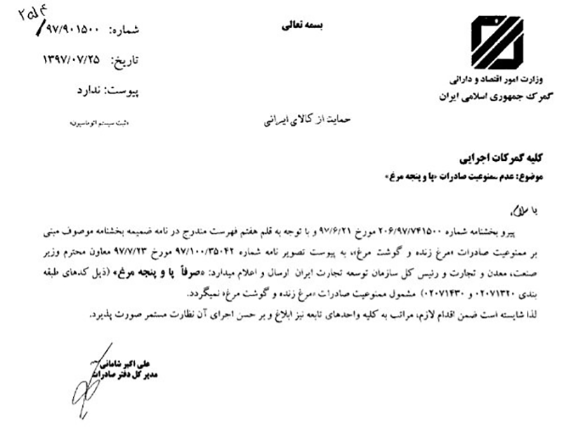 گمرک ایران در بخشنامه ای به گمرکات اجرایی کشور اعلام کرد: صرفا صادرات پا و پنجه مرغ آزاد است و ذیل ممنوعیت صادرات مرغ زنده و گوشت مرغ قرار نمی گیرد.
