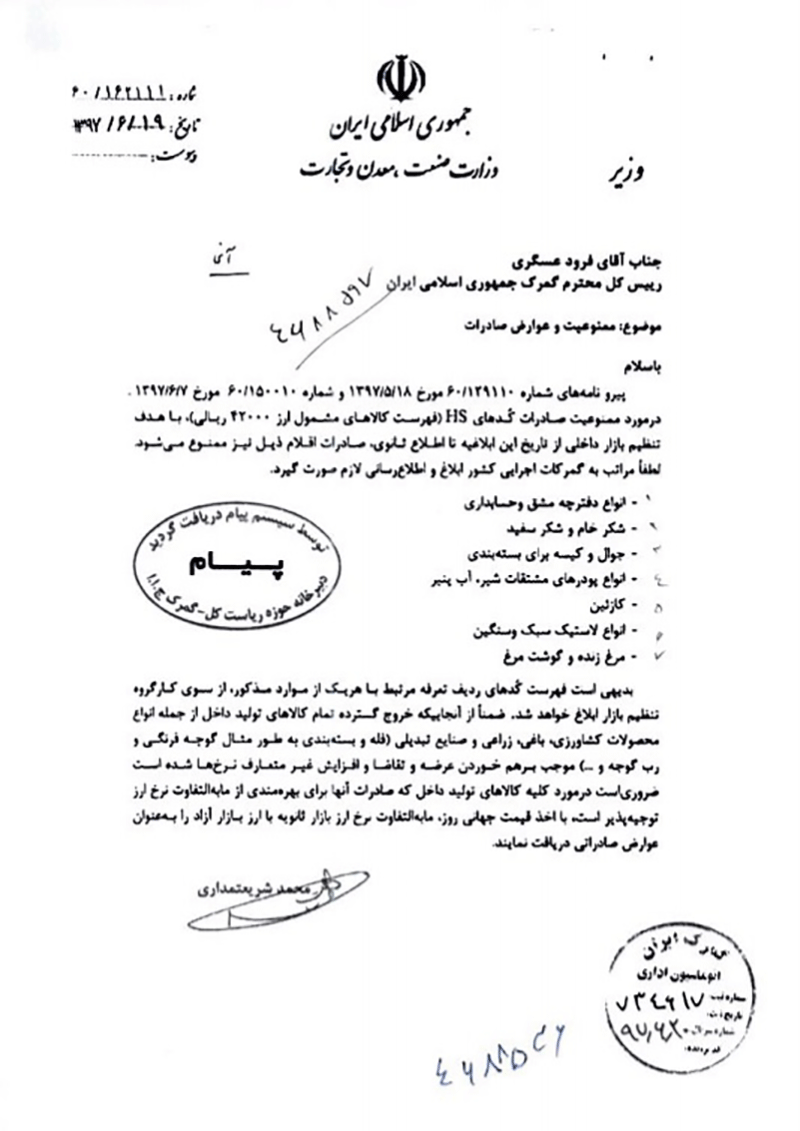 محمد شریعتمداری وزیر صنعت روز ۱۹ شهریور ماه در نامهای به رییس کل گمرک خواستار ممنوعیت صادرات این هفت قلم کالا شده بود.