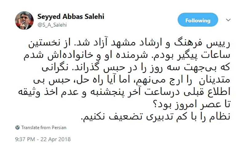 به گزارش شریان نیوز،وزیر ارشاد در واکنش به ماجرای بازداشت و آزاد شدن رییس اداره فرهنگ و ارشاد اسلامی مشهد در توییتر نوشت: «رییس فرهنگ و ارشاد مشهد آزاد شد. از نخستین ساعات پیگیر بودم. شرمنده او و خانوادهاش شدم که بیجهت سه روز را در حبس گذراند.