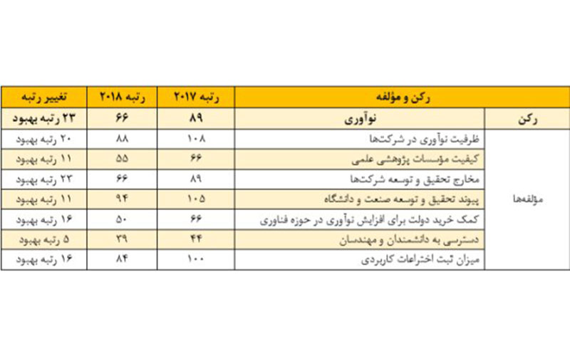 برمبنای مولفه های شاخص «نوآوری»، ایران در موضوع ظرفیت نوآوری شرکتها رتبه ۶۶، در زیرشاخص کیفیت موسسات علمی پژوهشی رتبه ۸۸، در مخارج تحقیق و توسعه رتبه ۵۵، در پیوند تحقیق و توسعه صنعت و دانشگاه رتبه ۶۶، در کمک خرید دولت برای افزایش نوآوری رتبه ۹۴، در دسترسی به دانشمندان و مهندسان رتبه ۳۹ و در میزان ثبت اختراعات کاربردی رتبه ۸۴ را در میان کشورهای جهان به خود اختصاص داده است.