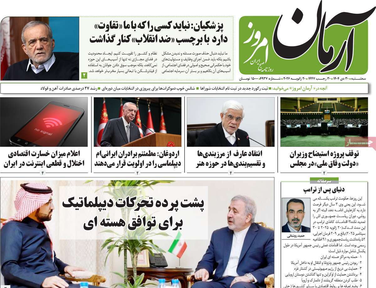 بازتاب_ اعتراف ترامپ به عملیات تروریستی در تهران، بازگشت بهارستان به مسیر وفاق، دلارهای برباد رفته، مردمستیزهای بیوطن و پهلوی عامل شکست براندازان از عناوین روزنامههای امروز است.