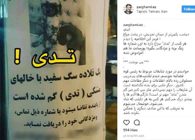 ضرغامی در جستجوی سگ گمشده در تجریش /پیداشدن این سگ برایم از شایعه علیه رئیس قوه قضاییه مهمتر است!