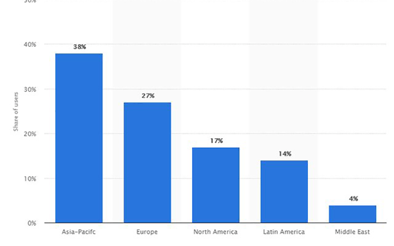 بر اساس نمودار زیر، میتوان به وضوح دریافت که منطقه شرق آسیا و اقیانوسیه با اختصاص ۳۸ درصد از تعداد کل کاربران ارزهای مجازی در جهان رتبه نخست این رده بندی را به خود اختصاص داده اند. طرفداران ارزهای مجازی همچون بیت کوین در منطقه اروپا با ۲۷ درصد در جایگاه دوم و آمریکای شمالی با ۱۷ درصد در رتبه سوم جای گرفتهاند.