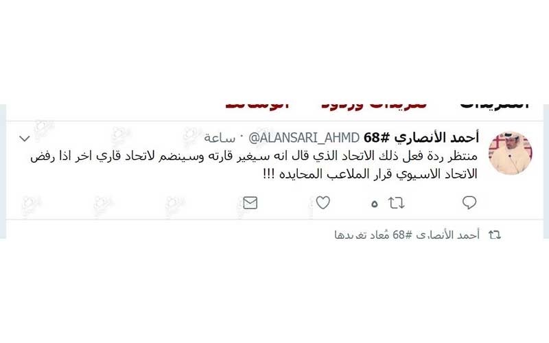 طبق اعتراف رئیس هیئت ورزش عربستان و گزارشگر مشهور اماراتی رای AFC امروز به نفع قطر خواهد بود. در این راستا محمد الانصاری، مدیر روابط عمومی باشگاه السد قطر با طعنه مستقیم به سعودیها در صفحه شخصی خود نوشت: منتظر واکنش فدراسیونی هستیم که پیش از این گفته بود اگر AFC قانون بازی در زمین بی طرف را قبول نکند از کنفدراسیون فوتبال آسیا خارج میشود به قارهای دیگر میرود!!!
