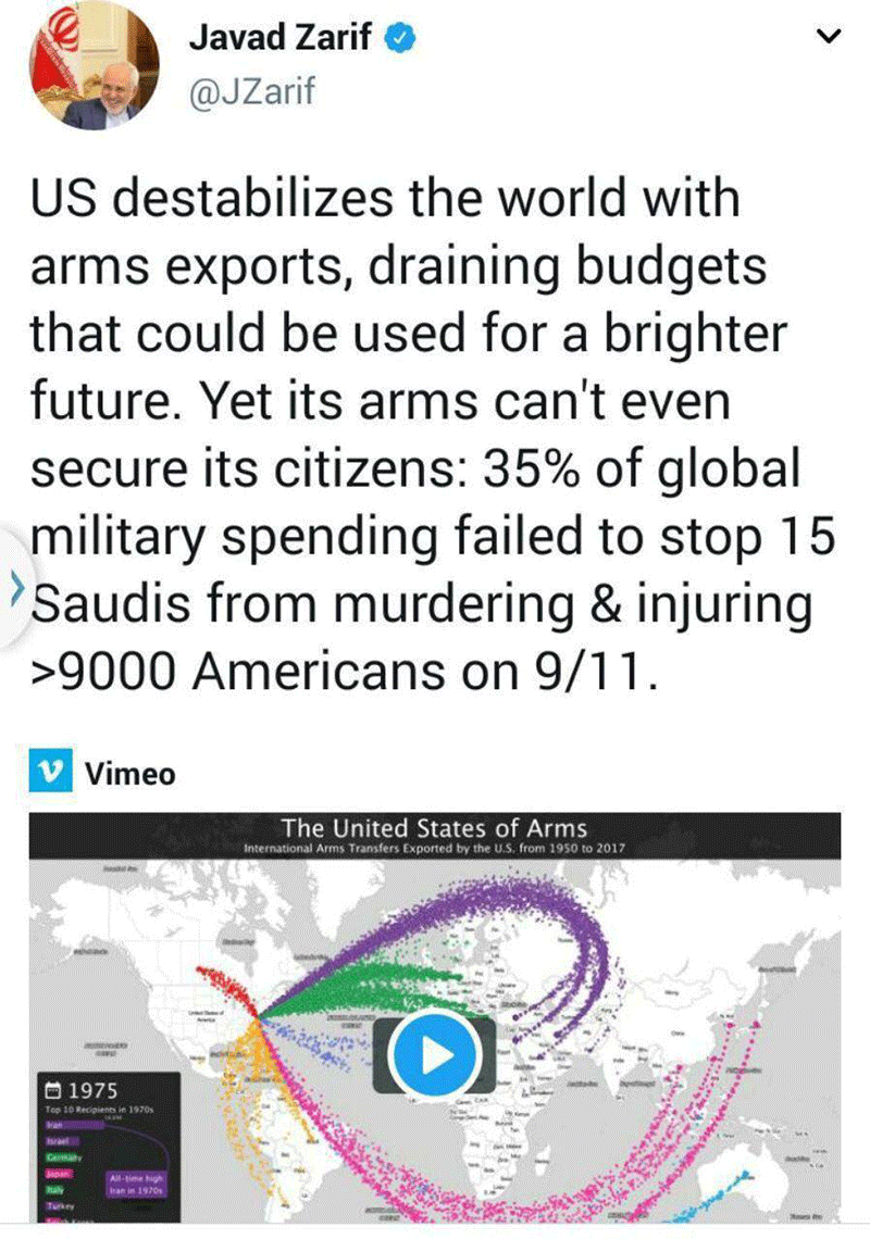 محمد جواد ظریف وزیر امور خارجه کشورمان در توییتر خود نوشت: آمریکا دنیا را با صادرات سلاح خود بی ثبات نموده و بودجه هایی که می‌توانند برای ساختن فردایی بهتر مصرف شوند را به هدر می‌دهد؛ ولی سلاح‌های او حتی نتوانسته به شهروندان خودش امنیت دهد: ۳۵ درصد هزینه نظامی جهان نتوانست مانع کشته و مجروح شدن بیش از ۹۰۰۰ آمریکایی توسط ۱۵ شهروند سعودی شود.